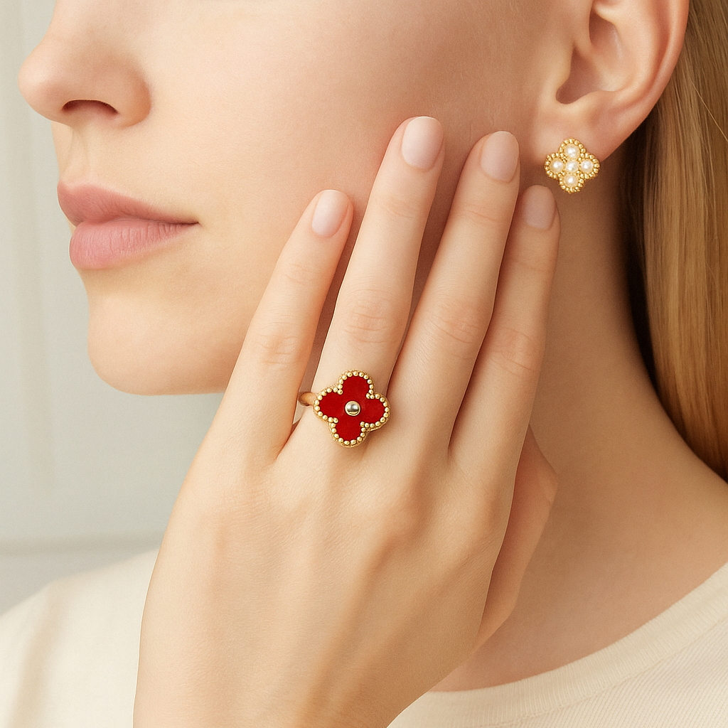 Deze verfijnde ring met een klavervormige top staat symbool voor geluk en elegantie. Het speelse, vrouwelijke design maakt hem perfect om dagelijks te dragen of als betekenisvol cadeautje aan jezelf.